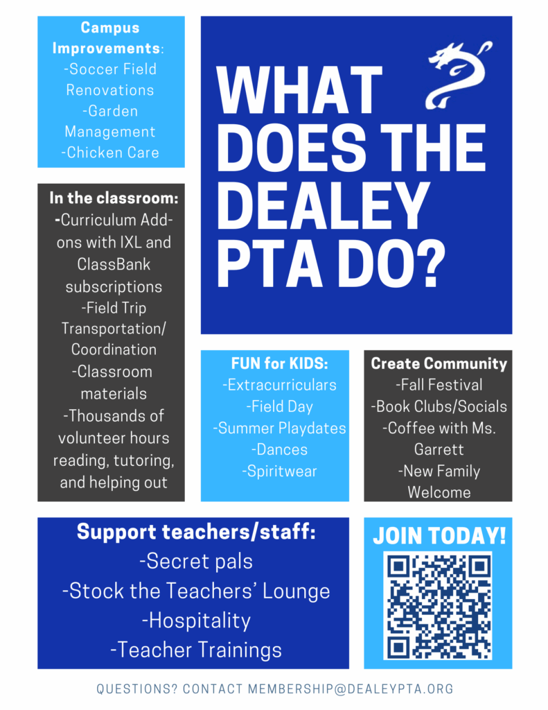 The #1 reason to join the PTA is to benefit your student! Our mission is to foster communication and cooperation between parents, faculty and community to ensure that your Dealey students develops to their full potential emotionally, socially, and intellectually. We need your help to do it!