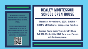 Dealey’s Admissions Open House November 6, 2025 5:00PM – 7:00PM For prospective families We invite you to explore our admissions process, visit our campus, and discover what makes our school so special. More information about the application process can be found here. Campus tours are held on Thursdays at 9:00AM. Please call the front office…
